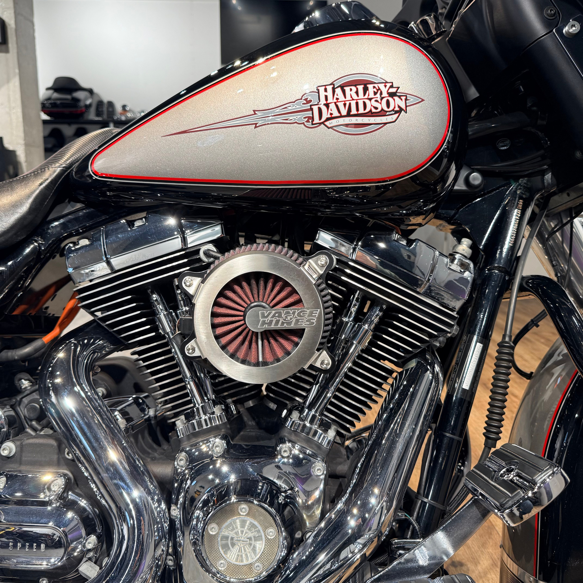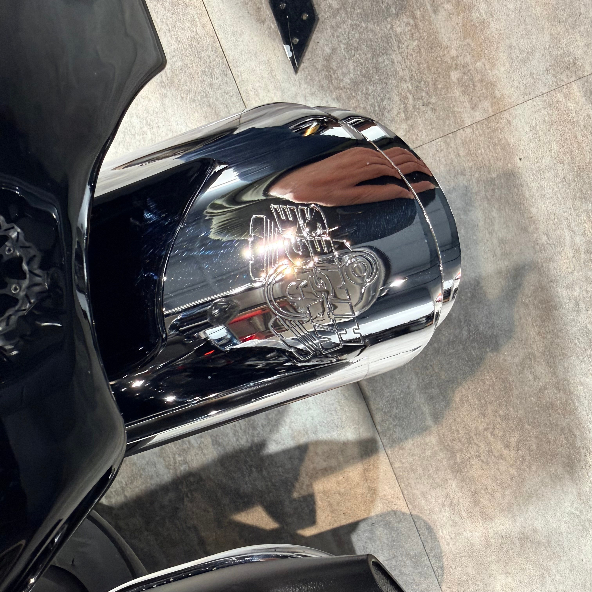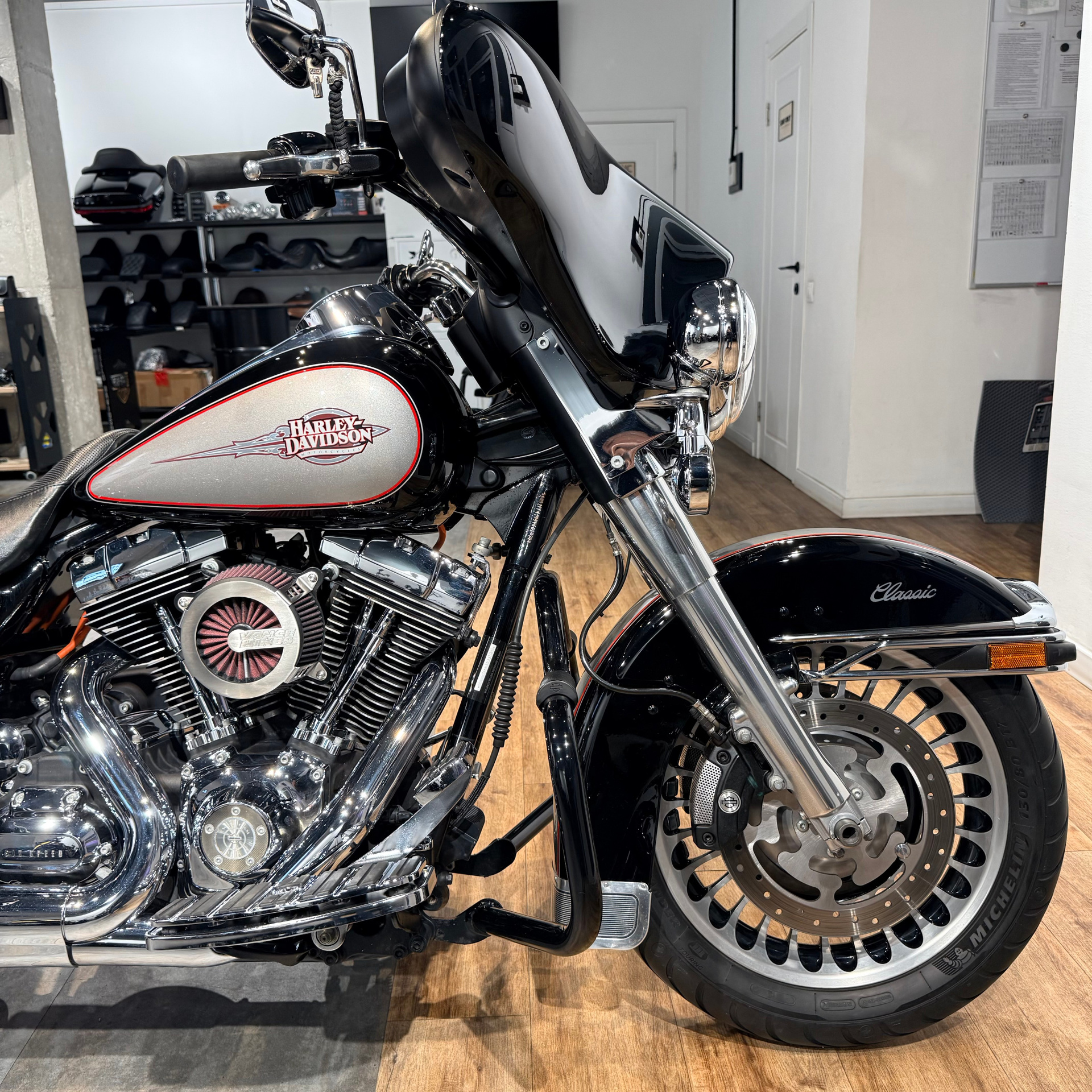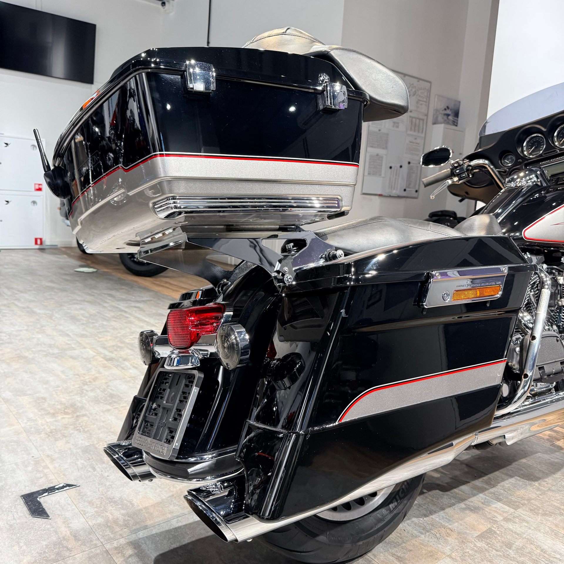 - Очень хорошая комплектация: широкая рама, тормоза ВRЕМВО с АВS, колеса-турбины, красивый заказной цвет + дополнительно: глушитель и воздушный фильтр Vаnсе& Нinеs, удлинители кофров, турпак сделан быстросъемным, много хромированных деталей, черная защитная дуга с выносами для ног и т. д.;